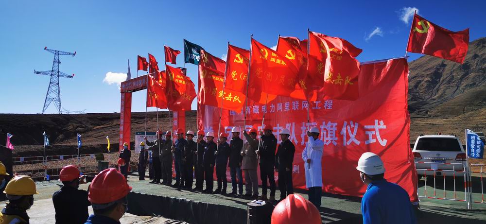 圖為在國網(wǎng)西藏電力阿里聯(lián)網(wǎng)工程黨、團員突擊隊授旗儀式上,工程建設(shè)者們在世界屋脊高擎旗幟