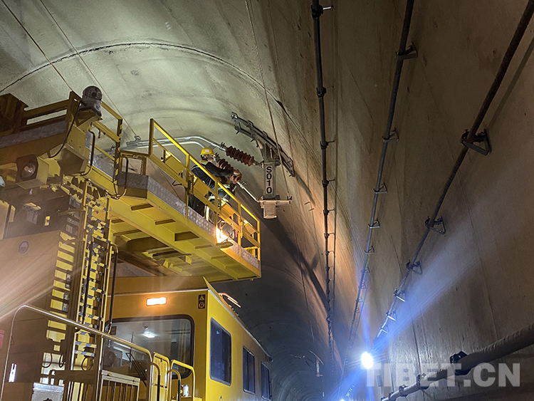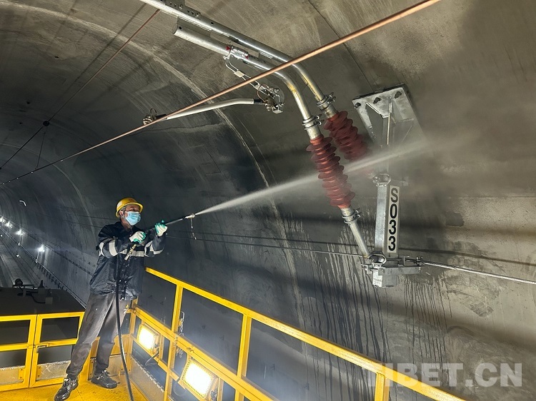 中國(guó)西藏網(wǎng)訊 初冬時(shí)節(jié),雅魯藏布江畔,秋葉繽紛、層林盡染。在穿山過(guò)江的拉林鐵路桑珠嶺隧道內(nèi)機(jī)器轟鳴、人聲鼎沸。11月14日10時(shí)25分,中國(guó)鐵路青藏集團(tuán)有限公司拉薩基礎(chǔ)設(shè)施段桑日綜合維修車間的接觸網(wǎng)工陳世召頭戴安全帽、身穿防雨服、腳踩絕緣靴,手中的高壓水槍迸射出道道白色弧線。