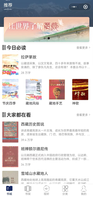 “掌讀西藏”為讀書公益類平臺(tái),免費(fèi)向讀者提供中國西藏主題的電子圖書。目前有《古格王國》《神歌》《達(dá)賴?yán)镛D(zhuǎn)世制度》《班禪額爾德尼傳》《拉薩掌故》《雪域山水藏地人》《節(jié)慶四季》《西藏歷史圖說》《進(jìn)軍西藏日記》等29本電子圖書。這些電子圖書都是作者寶貴的知識(shí)結(jié)晶,也是對(duì)中國西藏珍貴的歷史記憶,濃縮了幾代人見證中國西藏發(fā)展的時(shí)代烙印。