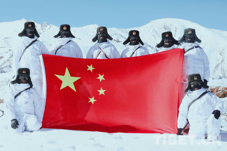 圖為阿里軍分區(qū)某邊防團(tuán)官兵在巡邏路上展示國(guó)旗 攝影:劉曉東