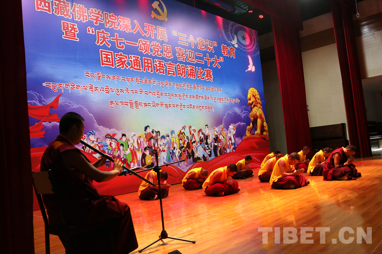 圖為2022年7月1日,西藏佛學(xué)院舉行的“慶七一頌黨恩 喜迎二十大”國家通用語言朗誦比賽現(xiàn)場由2021級學(xué)制班學(xué)員表演笛子獨(dú)奏《我愛你中國》和瑜伽表演 攝影:王佳豪