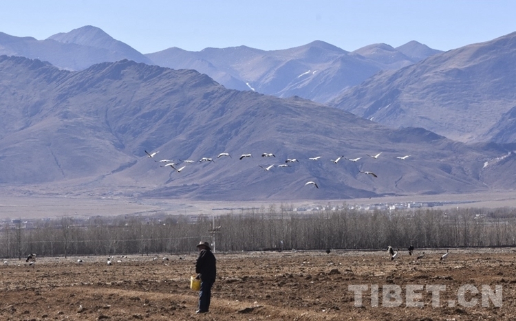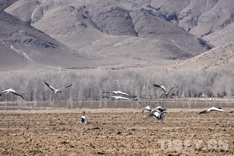 中國(guó)西藏網(wǎng)訊 地處雅魯藏布江中游河谷地帶的西藏自治區(qū)拉薩市林周縣,被稱為拉薩“糧倉”。每年的冬季,林周縣虎頭山水庫因兩面夾山,周邊有大片的良田,成為黑頸鶴覓食、夜棲的佳地。