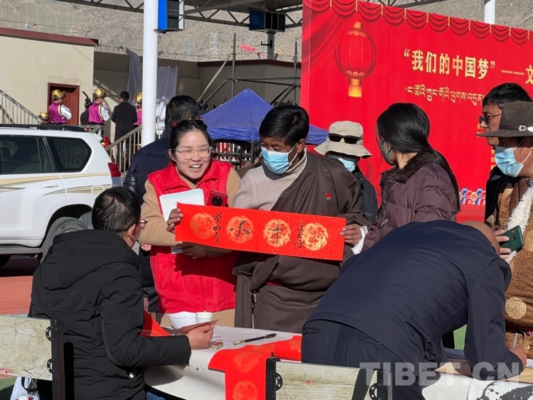 圖為書法家為群眾書寫新年祝福(書寫內(nèi)容:扎西德勒) 攝影:德吉卓瑪