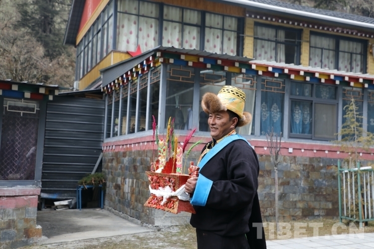 天亮以后,扎西江村一家人穿上新衣服,輪流敬切瑪、喝青稞酒,互道“扎西德勒”。扎西江村家的小女兒達娃倉決吃切瑪?shù)臅r候,先用拇指和食指抓起一小撮糌粑灑向空中3次,表示敬天地,然后把糌粑放進自己嘴里。喝青稞酒也同樣如此,要先用雙手接過酒杯,然后左手拿杯,右手無名指輕輕地在杯中蘸酒,彈向空中,如此反復三次。