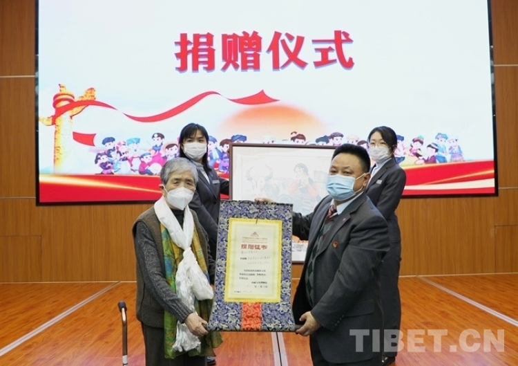 圖為中國(guó)藏學(xué)研究中心西藏文化博物館向畫(huà)家吳茜女士(左)頒發(fā)捐贈(zèng)證書(shū)