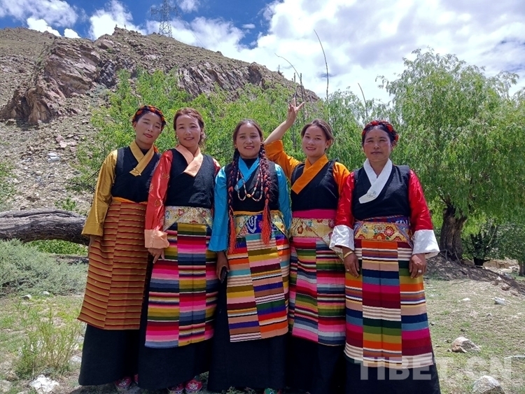 圖為西藏拉薩曲水縣茶巴朗村婦女在望果節(jié)上身著當(dāng)?shù)夭匮b拍照留念 攝影:次吉