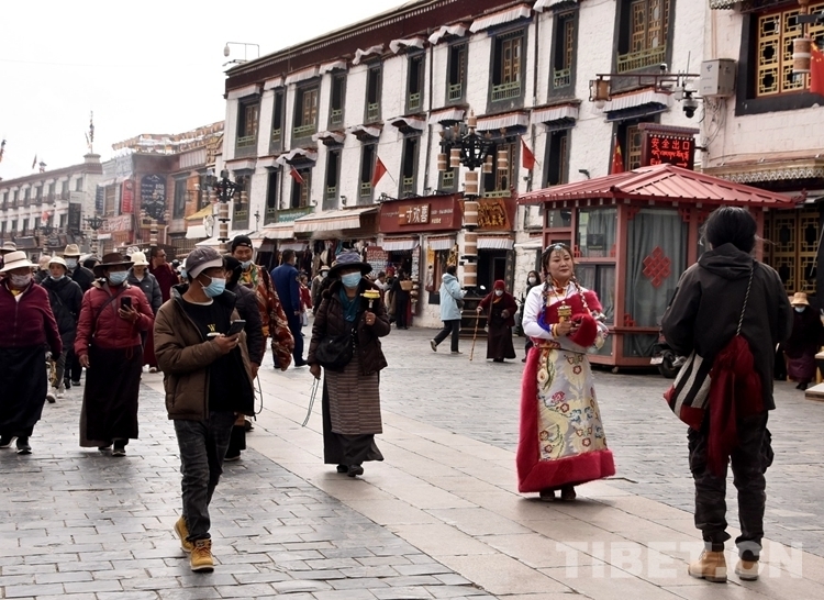 圖為3月15日,游客身著藏族傳統(tǒng)服飾在拉薩八廓街拍照留念 攝影:次旦拉姆