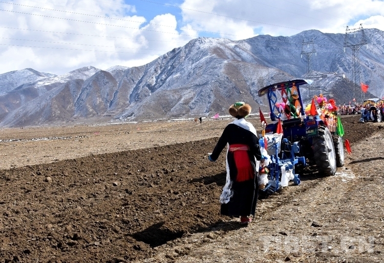 在雪水浸潤(rùn)過的肥沃土地上,深耕機(jī)車輪翻滾而過,駛過的土地上翻起深色的泥土,婦女們跟在后面播撒青稞良種。