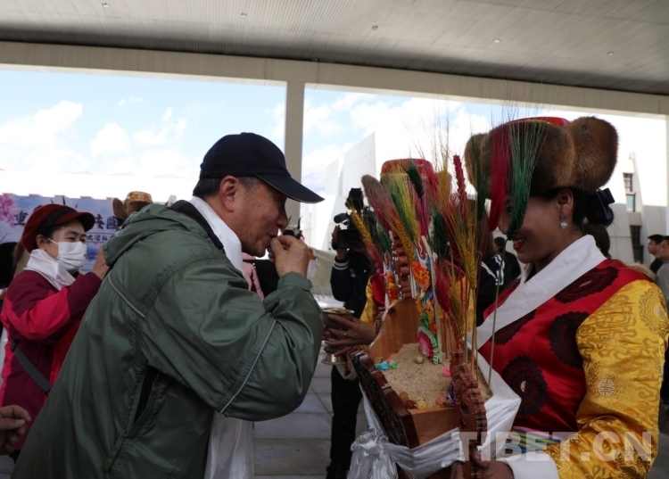 圖為歡迎儀式上,歡迎人員敬獻“切瑪”,歡迎“老西藏”。葉鵬(左)熟練地以藏族禮節(jié)回應 攝影:王茜