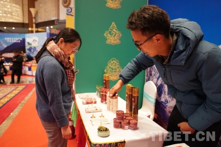 圖為特色展區(qū)處工作人員正向游客介紹藏香 攝影:王淑