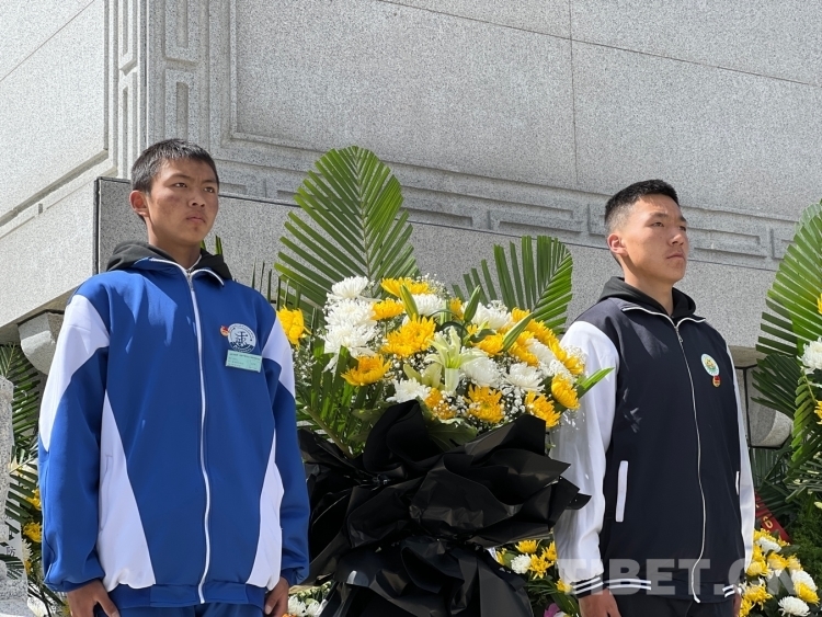 圖為拉薩那曲第一高級中學(xué)學(xué)生代表向革命先烈敬獻花籃 攝影:德吉卓瑪