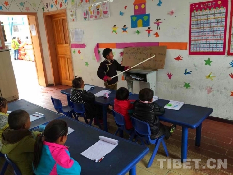 圖為山南洛扎縣生格鄉(xiāng)的學(xué)校(含幼兒園到小學(xué)3年級(jí)),孩子使用老師做的詞卡做小老師 2016年拍攝