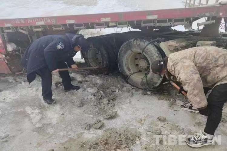 民警抵達現(xiàn)場,首先確認了司機身體狀況良好。在了解情況后,與司機共同對車輛開展救援工作。經(jīng)過一段時間努力,仍無法將被困車輛拖離被困地。經(jīng)與司機協(xié)商決定,先行將其帶至曲松鄉(xiāng)妥善安頓,而后協(xié)調駐地友鄰單位用重型車輛救援被困車輛。最終在友鄰單位的幫助下,被困近20小時的半掛車成功脫困。
