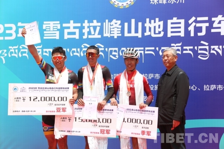 圖為獲得男子精英組冠軍西藏亞車隊(duì)選手江村羅布、亞軍西藏亞車隊(duì)扎頓、季軍拉薩朋友車隊(duì)選手索朗 攝影:德吉卓瑪