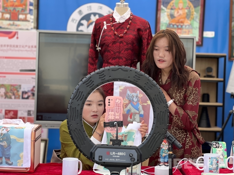 在展示交流區(qū),兩名穿著藏裝的姑娘正在通過直播向觀眾介紹有十二生肖圖案的被子、手機殼、筆記本等各類產(chǎn)品,也吸引著現(xiàn)場嘉賓前來參觀?!斑@些作品是民族文化產(chǎn)業(yè)系學生的作品,圖案都是學生自己繪畫的原創(chuàng)文創(chuàng)產(chǎn)品?!蔽鞑丶紟煂W院數(shù)字信息產(chǎn)業(yè)系教師桑珍介紹,“兩位姑娘是21級電商專業(yè)學生,通過這次活動一方面希望自己得到鍛煉,另一方面也是為7月份的電商大賽做前期的培訓?!?/p>