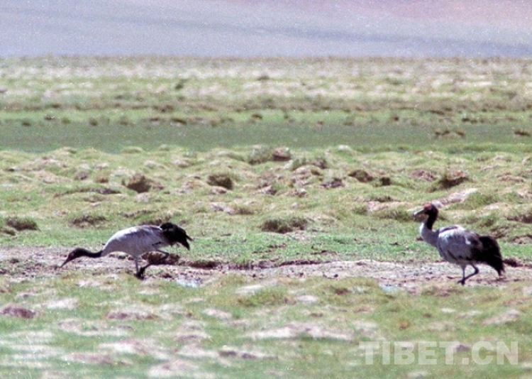 這是兩只漫步在藏北色林錯(cuò)國(guó)家級(jí)自然保護(hù)區(qū)的國(guó)家一級(jí)保護(hù)動(dòng)物、被稱(chēng)為“鳥(niǎo)類(lèi)熊貓”的黑頸鶴(唐召明2001年攝)
