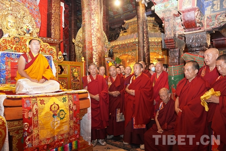 大昭寺大殿的主殿內(nèi),供奉有唐代文成公主帶入雪域高原的釋迦牟尼十二歲等身佛像。班禪入內(nèi),虔誠而莊重地向佛像叩頭朝拜、敬獻哈達。隨后,班禪登上該殿對面的法座,面朝釋迦牟尼十二歲等身佛像,帶領(lǐng)僧眾念誦經(jīng)文,祈愿國泰民安、風調(diào)雨順。禮佛結(jié)束后,班禪為大昭寺僧眾摸頂賜福。