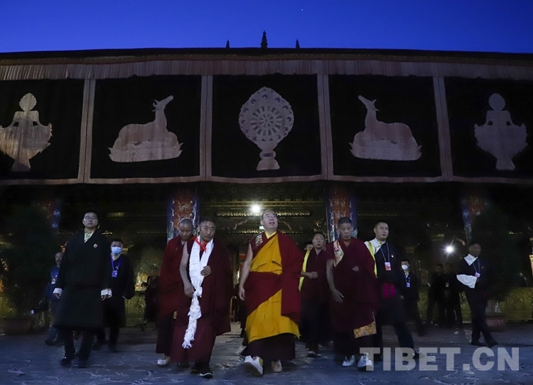 夜色中的古城拉薩靜謐祥和,千年古寺大昭寺燈火通明。凌晨5時許,大昭寺的僧人組成“色彰”隊,高舉經(jīng)旗、手持藏香,以藏傳佛教最高禮儀在通往大殿的兩側(cè)列隊恭迎班禪。