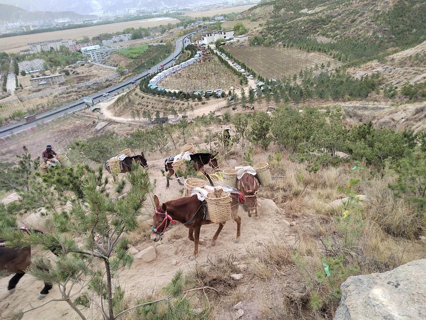圖為騾隊在綠化片區(qū)運輸樹苗 圖片來源:西藏自治區(qū)慈善總會官網(wǎng)