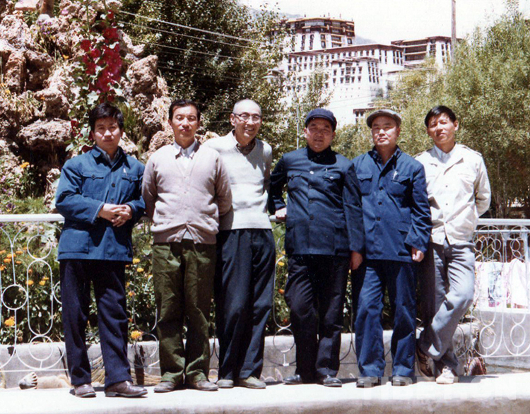 原國務(wù)院西藏經(jīng)濟(jì)工作咨詢組駐藏組范小建(右一)與本組人員趙清政、石萬鵬、齊曉魯、府培生、冉令申(從左至右)在拉薩布達(dá)拉宮前合影留念(范小建提供,1984年6月攝)