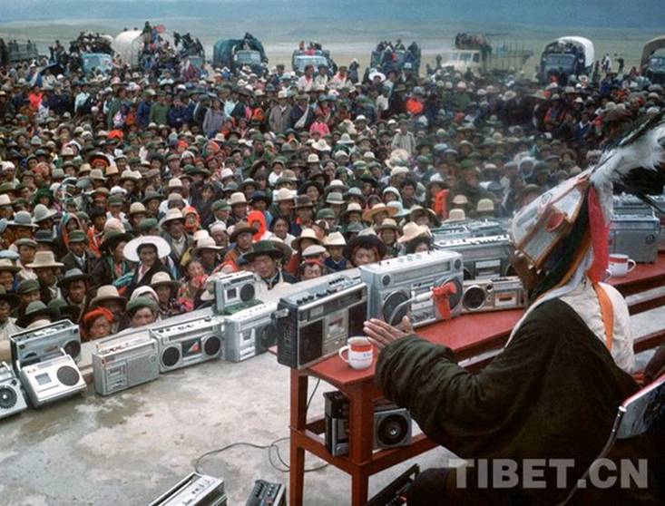 圖為說唱藝人阿達(dá)在西藏那曲賽馬會上說唱《格薩爾》的傳奇故事,臺上擺滿了牧民群眾的各式錄音機(才龍1985年前后攝)