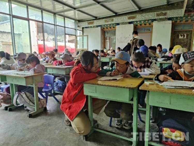 圖為人文科考隊(duì)員輔導(dǎo)孩子做作業(yè)