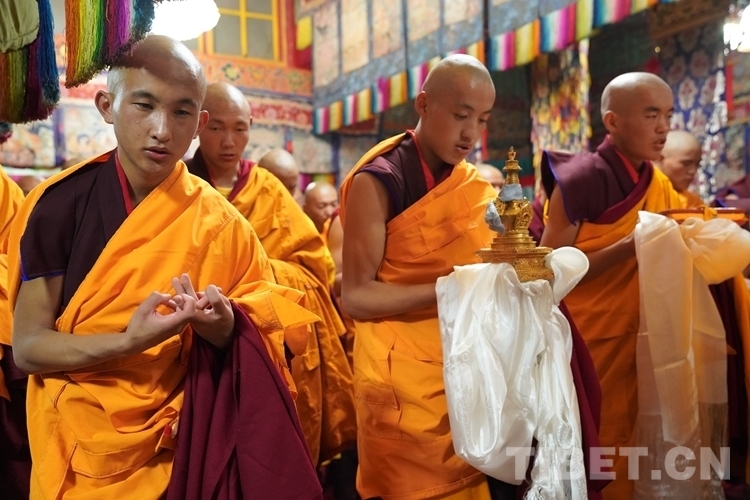 當天清晨,扎什倫布寺桑煙繚繞、法號聲聲,28 位受戒的年輕僧人帶著新制袈裟,迎著朝霞依次走向拉讓殿等待班禪授戒這一神圣時刻的到來。8時許,在手持黃傘、香爐和吹嗩吶的高僧護送引領下班禪緩緩步入拉讓殿,并與在場僧眾集體誦經(jīng)。誦經(jīng)儀式結(jié)束后,班禪就坐于拉讓殿寶座,4名高僧大德作為授戒眾,開始為僧人閉門授戒、剃度、賜法名、摸頂。此時,受戒僧人一一入座,兩手在胸前交叉,聽班禪引證經(jīng)典告誡,并宣誓嚴守戒律。