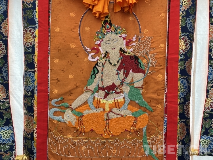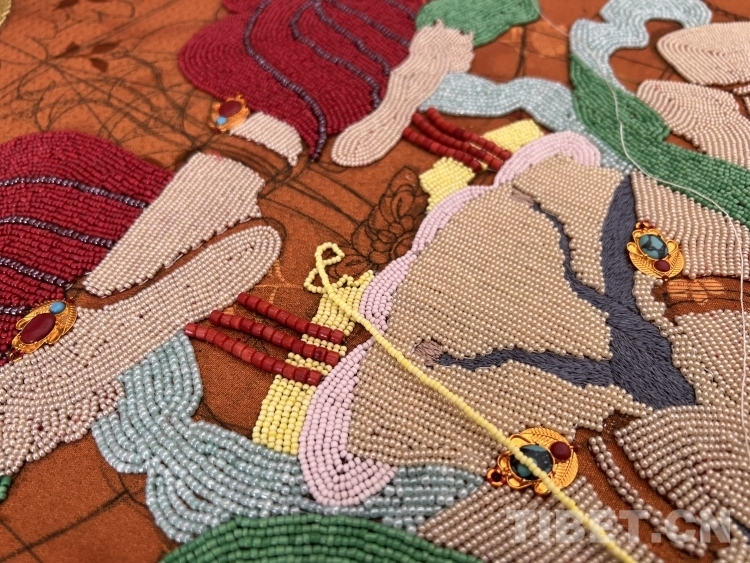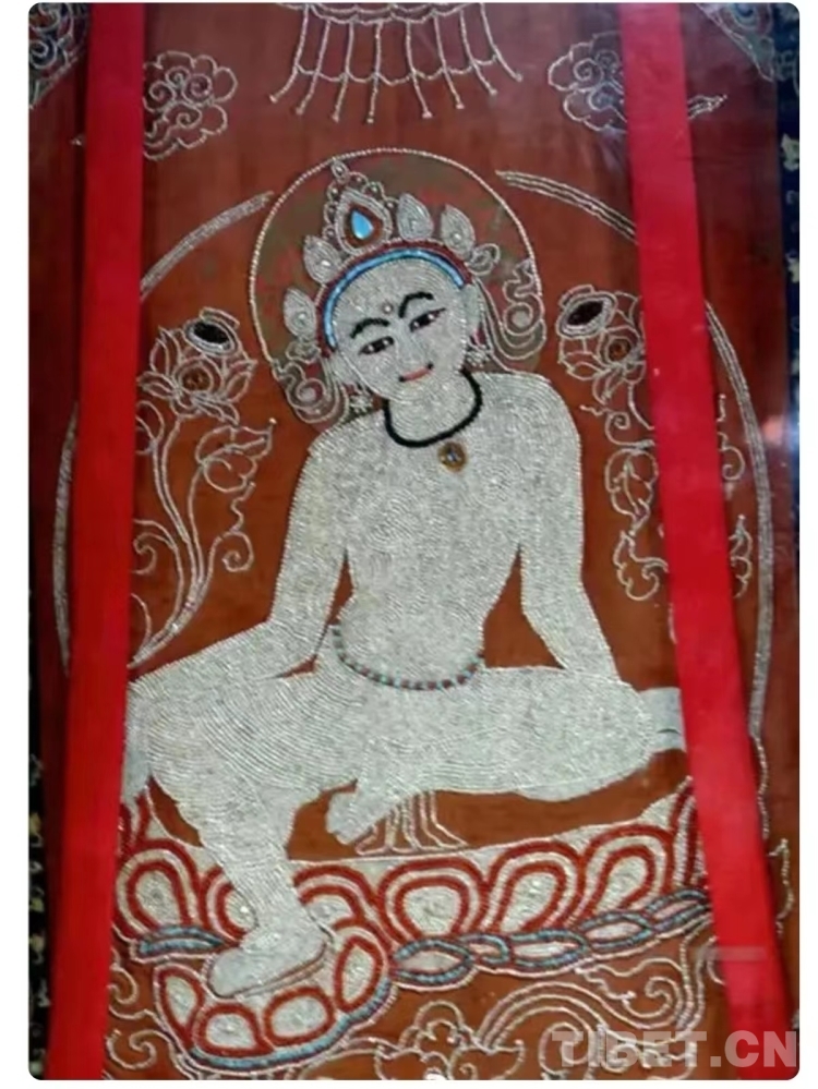 掌握了藏繡技藝,夫妻二人有了新的發(fā)展目標(biāo)。在傳承和發(fā)展傳統(tǒng)堆繡技藝的同時,土旦想要創(chuàng)新更有特色的藏繡作品,于是創(chuàng)作“珍珠唐卡”的想法在他腦海中萌生?!爸韵胍獎?chuàng)作珍珠唐卡,是因為有次我在山南的昌珠寺看到了‘觀世音菩薩憩息圖’這幅珍珠唐卡,我被它精美絕倫的制作工藝深深吸引,心想自己從事堆繡創(chuàng)作多年,也應(yīng)該去嘗試制作‘珠繡’作品了?!蓖恋┫蛴浾咧v述了他與珍珠唐卡的“結(jié)緣”經(jīng)歷。