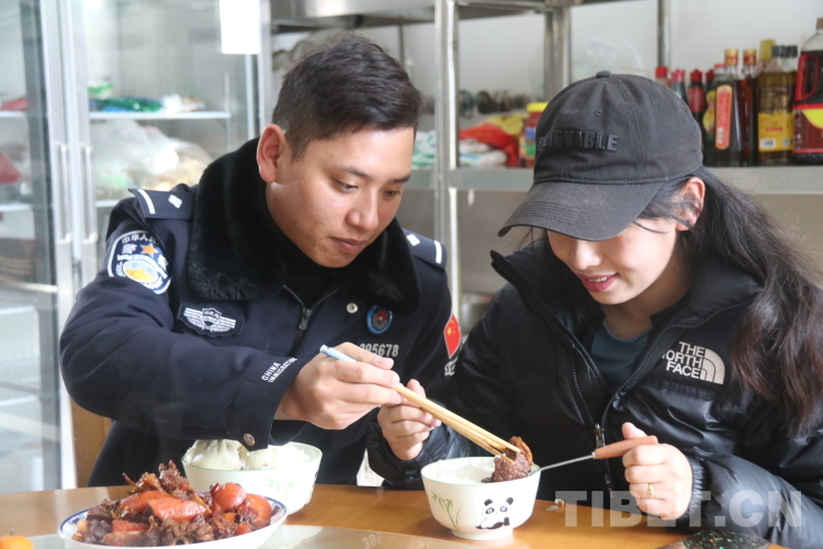 氧氣瓶、高原藥品、熱水......接德吉永措的車(chē)上已準(zhǔn)備好了各種抗高反和取暖的東西,這讓她提前感受到了來(lái)自丈夫單位的熱情與關(guān)懷。與愛(ài)人相聚后,旦增洛追帶著妻子參觀營(yíng)區(qū),迫切地想讓她了解他用青春為之奮斗的警營(yíng),隨后他又帶著妻子到單位食堂品嘗自己親自下廚做的紅燒肉?!班牛∥兜篮芎??!钡录来氤灾煞蚪o她夾的肉,臉上洋溢著幸福的笑容。