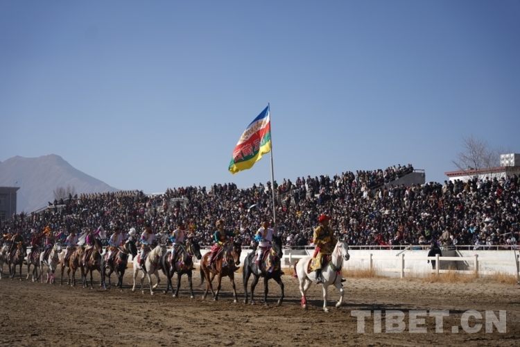 圖為西藏馬術(shù)隊入場給觀眾拜年 攝影:旦曲