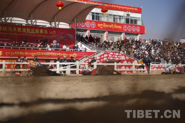 中國西藏網(wǎng)訊 2月12日上午,藏歷木龍新年初三民族傳統(tǒng)馬術(shù)表演暨民族賽馬活動在拉薩賽馬場舉行。此次活動包括民族賽馬和馬術(shù)表演。其中,民族賽馬包括3000米、5000米、8000米三個項目,馬術(shù)表演共有18個大項、20余個小項。馬術(shù)表演與民族賽馬穿插進(jìn)行。現(xiàn)場約8000名觀眾共同欣賞了精彩的馬術(shù)表演,觀看了激烈的速度賽馬,共慶佳節(jié)。