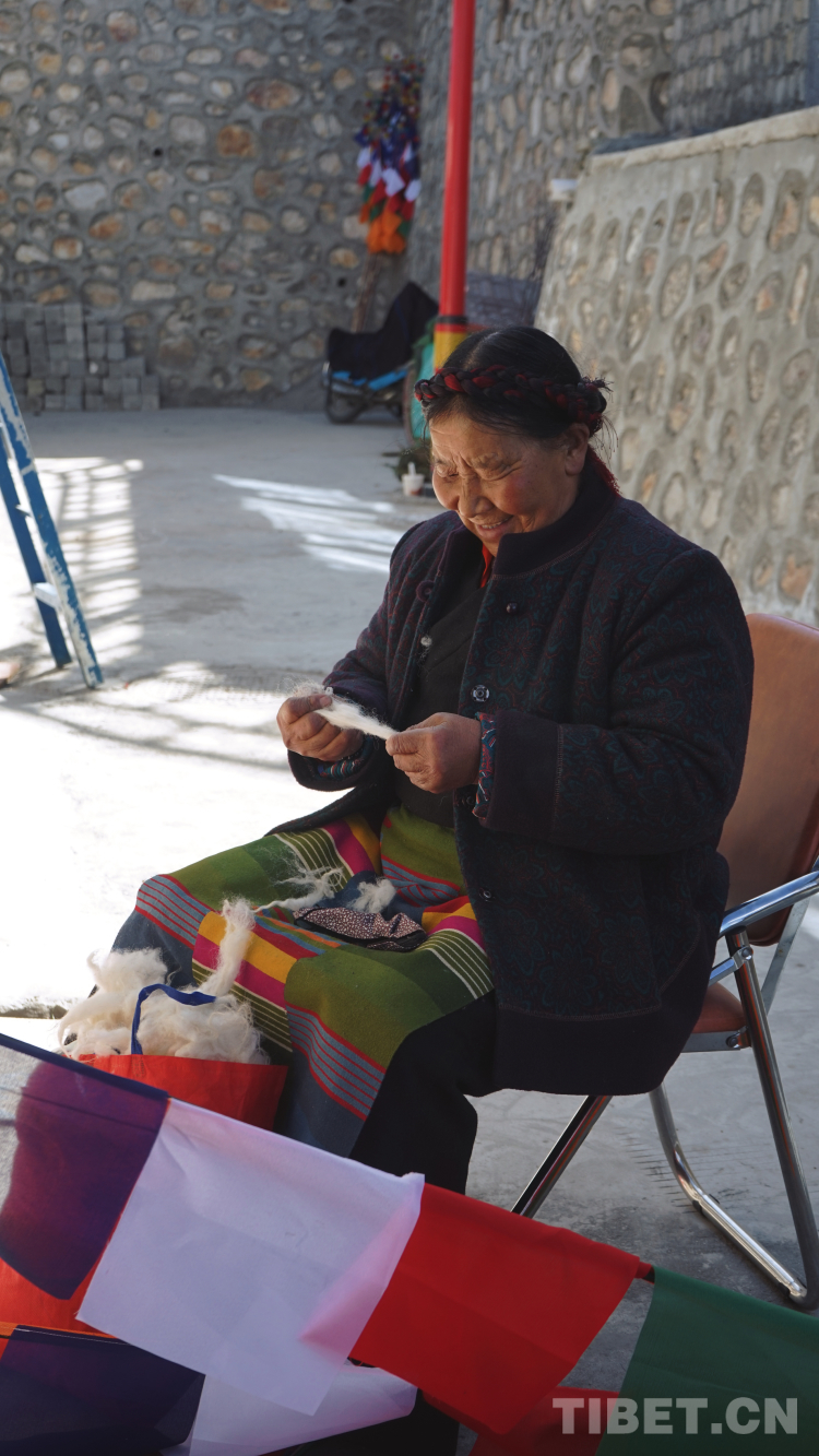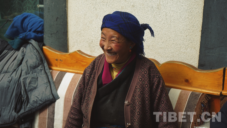 這是我最喜歡的莫啦。住在莫啦家的幾天里,除去采訪、收集素材和寫稿,最放松的時(shí)刻就是忙里偷閑和莫啦在廚房烤火、在巷子口曬太陽。莫啦會問我穿得這么少冷不冷,會給我講路過的小女孩有個(gè)雙胞胎姐姐,會讓我送熱水給我的同事喝,會拿盛滿卡塞和奶渣的點(diǎn)心盒塞給我吃,會在我想把手頭工作做完再吃飯時(shí)問同事我怎么不吃飯。當(dāng)然這些我大多是聽不懂的,有些是德瓊阿佳(莫啦的女兒,拉康社區(qū)婦女主任,同時(shí)也是客棧的老板)和達(dá)次哥(這次出差的司機(jī)師傅)翻譯給我的,有些是我倆通過比劃猜到的。