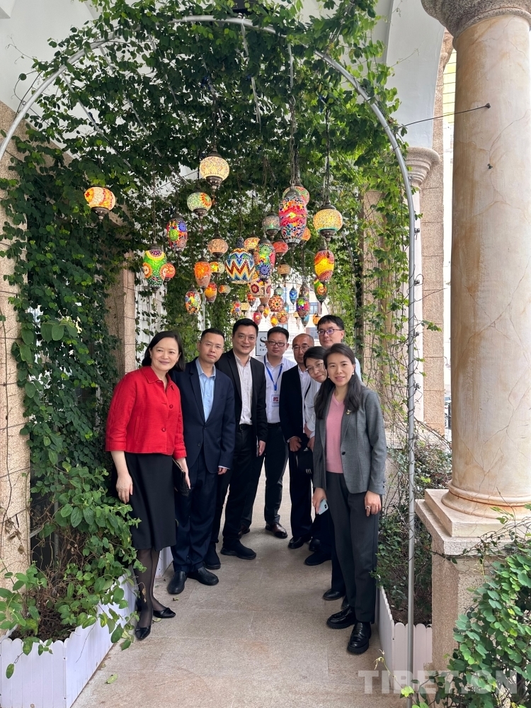 她親切地與帕洛扎用藏語交流,倆人一下子打開了話匣子。帕洛扎后來告訴我們,讓他感到非常驚喜和意外的是,卓瑪姐的藏語竟然說的如此標(biāo)準(zhǔn),是純正的拉薩話。只是學(xué)習(xí)了幾天藏語的我,僅能聽清楚幾個詞的發(fā)音,??????????(西藏)、?????(拉薩)、?????????(藏族),但是從他們聊天的神色中,我能感受到那種對西藏的情懷與在異鄉(xiāng)見到老鄉(xiāng)的親切與激動。我跟隨帕洛扎學(xué)了幾天藏語,雖然僅會說幾句簡單的問候語,但還是鼓起勇氣用藏語向卓瑪老師問候:“???????? ????????????????? ???????????????(老師,扎西德勒,我是呂靜)。”我的同事也緊跟著問候:“????????????? ???????????????????????????????????????(您好,我的名字叫曲瑩益西)?!鼻撘嫖魇俏疫@位同事的藏族名字。幾句藏語的問候一下子拉近了我們與卓瑪姐的距離,她驚喜又欣慰,原來我們都能講上幾句藏語。她還親切地勉勵我們,要多學(xué)多用藏語,對工作也會有很大幫助。當(dāng)她得知身邊坐著的同事是寧波人時,她還立馬切換寧波方言與對方聊天。原來卓瑪姐的母親是浙江寧波人,在家里都會講寧波話,而她的丈夫是葡萄牙人,她還能講葡萄牙語。具有極強(qiáng)語言天賦的她,在澳門這樣一個中西方文化匯聚的地方,作為澳門基金會行政委員會的一員,她也用自己的方式,不斷促進(jìn)中葡、藏澳等地經(jīng)濟(jì)、文化等方面的交流互促。