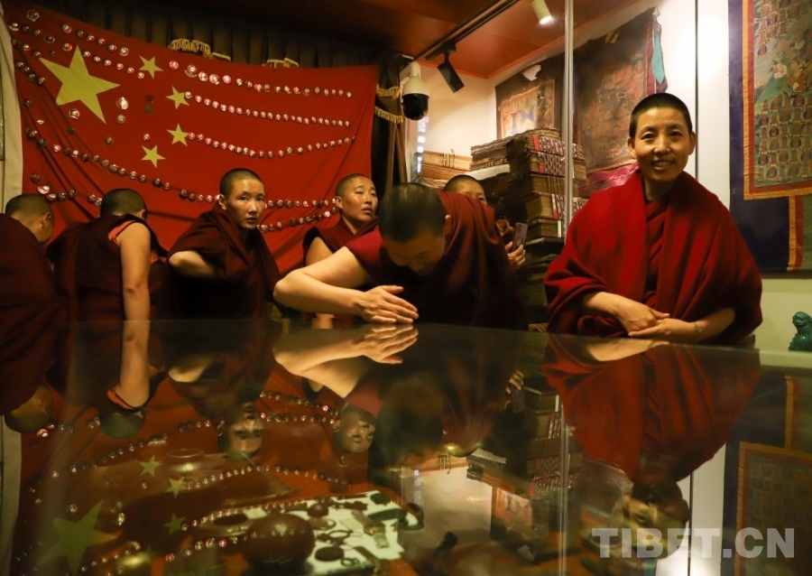 圖為尼眾在尼池拉康民族團結(jié)系列館參學