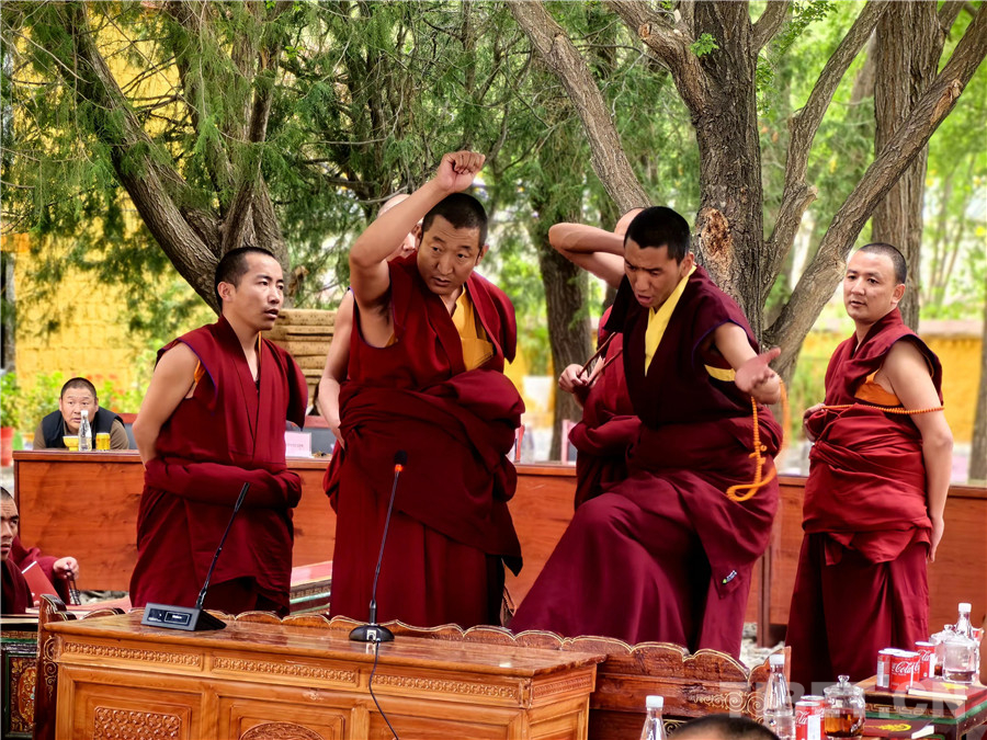 午后的陽(yáng)光慵懶地灑在辯經(jīng)場(chǎng),卻擋不住辯經(jīng)的智者們爭(zhēng)先恐后、高舉手臂提問(wèn),手臂向下?lián)]落,象征著智慧之劍砍向無(wú)知。熱烈的氣氛中,智者們拍手擊掌、獨(dú)立頓足、舞動(dòng)佛珠、慷慨陳詞、大聲質(zhì)問(wèn),仿佛如此便得到了無(wú)窮的智慧?;顒?dòng)現(xiàn)場(chǎng)氣氛十分熱烈、精彩紛呈,交流內(nèi)容充實(shí)飽滿、將所學(xué)與實(shí)際相結(jié)合,充分展現(xiàn)了日常所學(xué)所思所得,閃光思維的碰撞迸發(fā)了智慧的火花,贏得了現(xiàn)場(chǎng)觀眾拍手叫絕,陣陣掌聲。