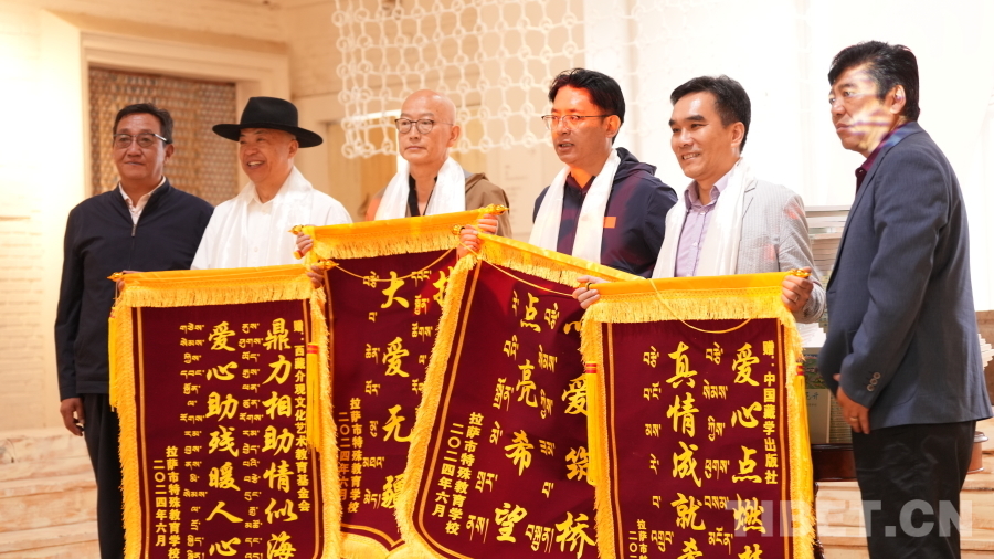 活動最后,中國藏學出版社向拉薩市特殊教育學校學生贈送繪畫用品,拉薩市特殊教育學校云旦平措校長、尼瑪書記向現(xiàn)場來賓贈送新書。