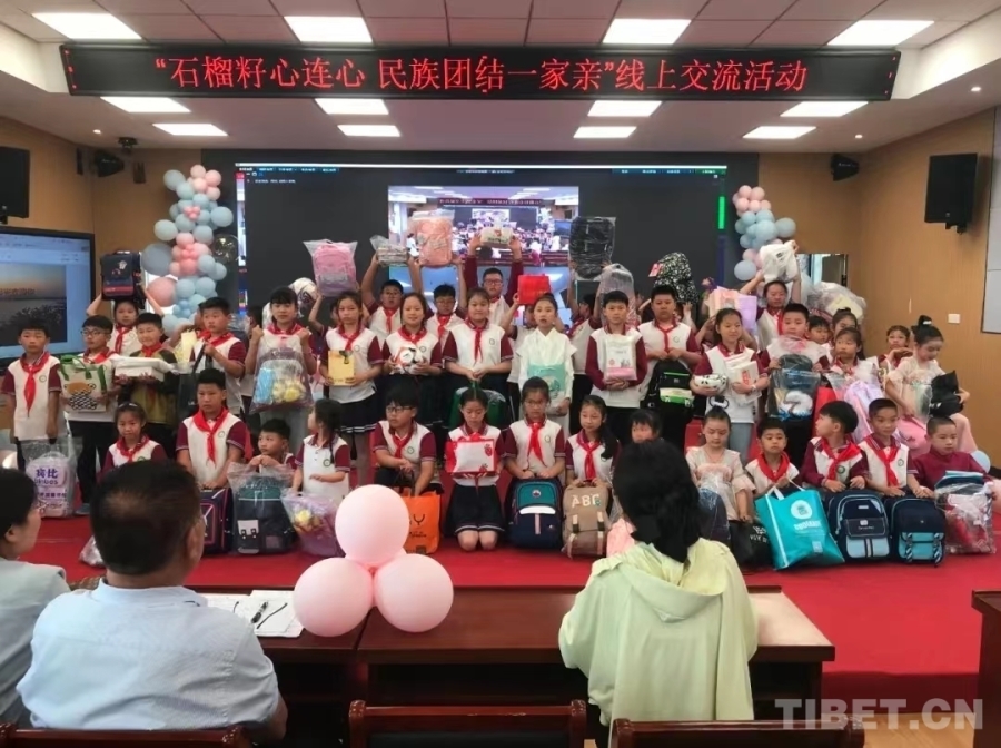 圖為安徽明光市明湖學校與西藏浪卡子縣打隆鎮(zhèn)小學開展“石榴籽心連心民族團結一家親”線上交流活動