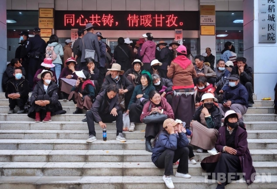 圖為7月8日,在稻城縣人民醫(yī)院門口,當(dāng)?shù)厝罕娫诘却刑?hào)、分診