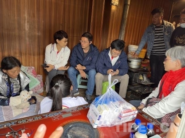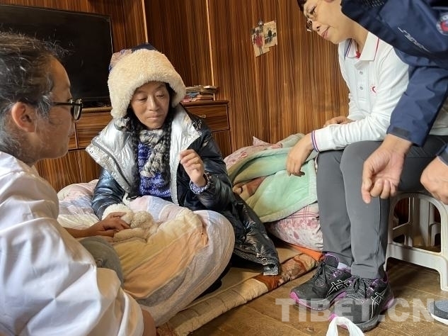 在義診活動進行的同時,幾位專家還分撥前往貧困家庭慰問。其中,北京地壇醫(yī)院的中醫(yī)科副主任楊玉英,北京地壇醫(yī)院婦科副主任劉軍,北京老年醫(yī)院呼吸科副主任劉前桂,北京大學(xué)第一醫(yī)院骨科副主任徐貝宇一行來到了離措拉鎮(zhèn)不遠的德西村山坡上,去阿珍家慰問看診。據(jù)了解,阿珍的母親沖曲措于 2019 年進行了胃癌手術(shù),術(shù)后做了五次化療,于 2020 年末完成化療。然而,2024 年 6 月份,沖曲措又被查出患有肺炎。由于吃不下飯,沖曲措體重嚴(yán)重下降,營養(yǎng)嚴(yán)重不良。。