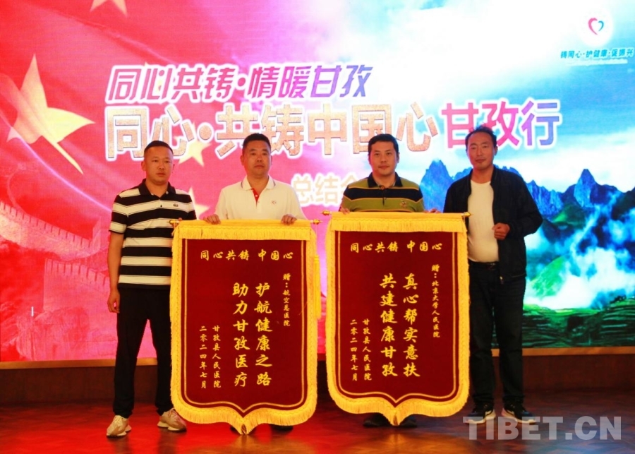 總結(jié)會(huì)上,甘孜縣有關(guān)領(lǐng)導(dǎo)向“同心·共鑄中國(guó)心”組委會(huì)贈(zèng)送了錦旗,向醫(yī)療專(zhuān)家志愿者代表送上了感謝信;甘孜縣人民醫(yī)院向北京大學(xué)人民醫(yī)院和航空總醫(yī)院贈(zèng)送了錦旗;醫(yī)療專(zhuān)家志愿者代表和志愿者代表分別談了活動(dòng)參與感受和建言。