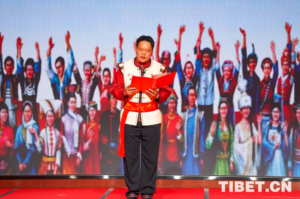 圖為西藏全區(qū)農(nóng)牧民國(guó)家通用語(yǔ)言文字基層宣講員匯報(bào)宣講活動(dòng)現(xiàn)場(chǎng),達(dá)拉才措正在舞臺(tái)上分享 攝影:趙振宇