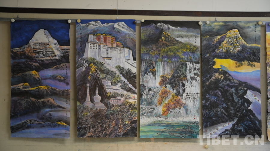 圖為尼瑪澤仁即將帶往法國(guó)的四幅展覽畫(huà)作,從左到右分別是《喜馬拉雅的金字塔岡底斯神山》《天上的西藏布達(dá)拉宮》《九寨水韻》《攀越珠峰》 攝影:陳浩力