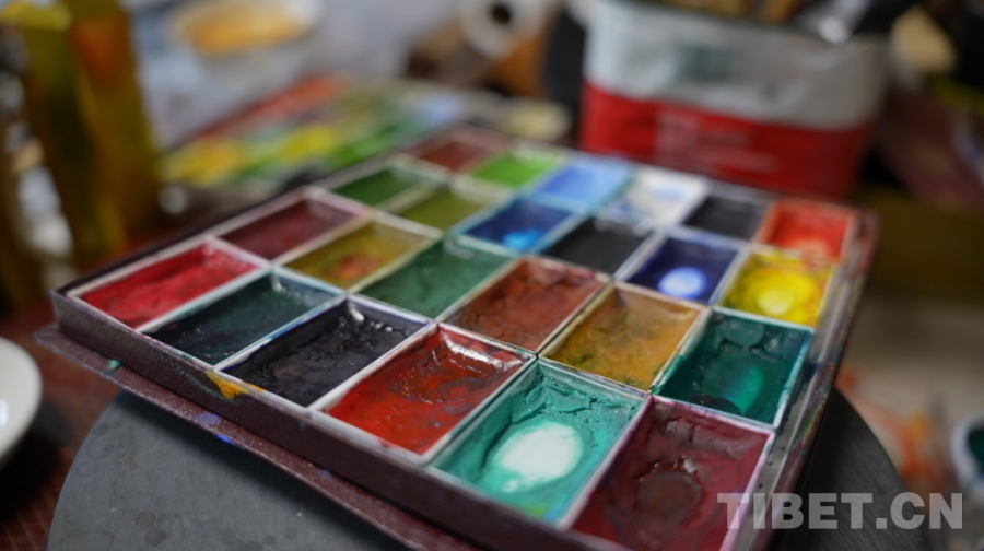 圖為尼瑪澤仁繪畫(huà)時(shí)使用的顏料盤(pán) 攝影:陳浩力
