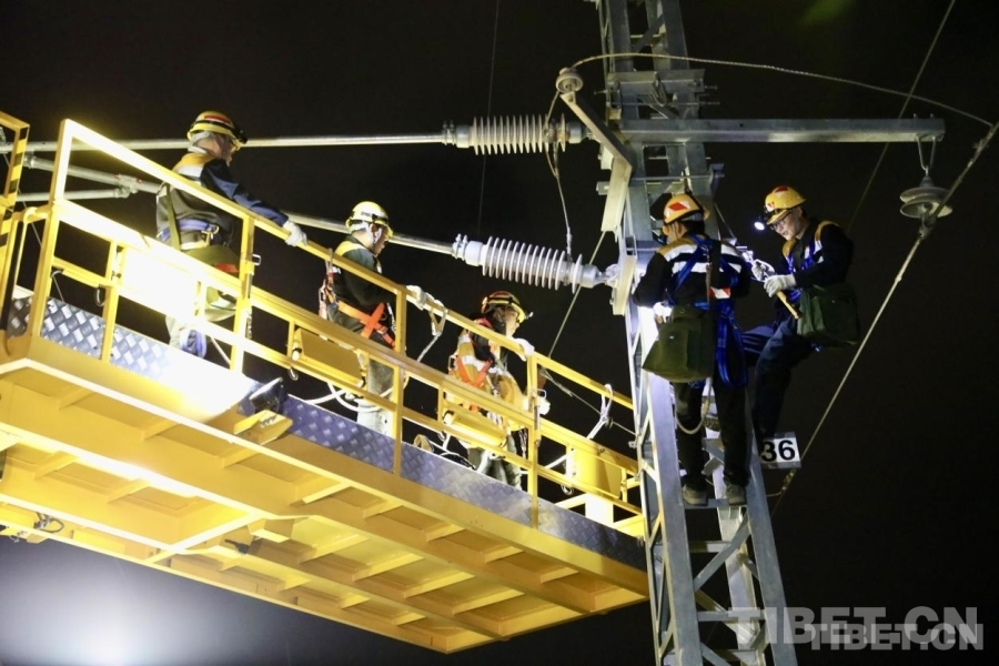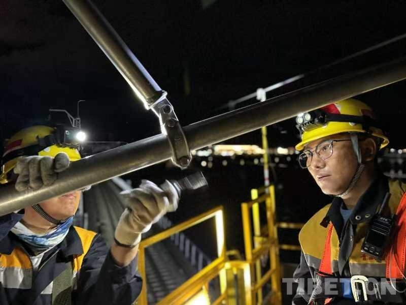 23時00分,軌道車穩(wěn)穩(wěn)停靠,“天窗”作業(yè)命令下達。中國鐵路青藏集團有限公司拉薩基礎設施段供電維修技術中心拉薩南接觸網(wǎng)維修隊工長李積王帶著7名工友走下接觸網(wǎng)作業(yè)車,驗電、連接地線端、接掛地線……一系列操作一氣呵成。隨即,現(xiàn)場負責人拉加和工友們依次登上距離地面6米高的作業(yè)平臺上,穿梭于接觸網(wǎng)線索之間,猶如凌空“舞者”。