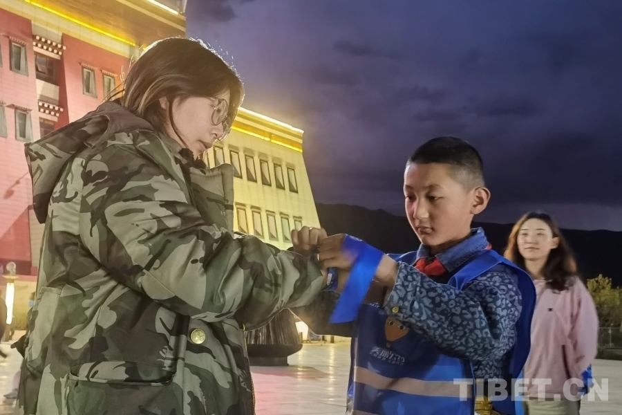 夜幕降臨,研學(xué)游團(tuán)隊來到文成公主劇場。穿上藍(lán)馬甲,孩子們搖身一變成了文明旅游的小小宣傳員。帕里鎮(zhèn)小學(xué)注重培養(yǎng)學(xué)生的生態(tài)文明意識,自2023年7月起,主動加入“美麗公約”志愿組織的“擦亮天路行動”。學(xué)生定期在帕里鎮(zhèn)清理垃圾,也會為沿國道562來到帕里的游客宣傳垃圾隨身走的文明旅游理念。今天,來到拉薩,孩子們再次熟練地向劇場周圍的觀眾宣傳起來,一邊為大家在右臂系上代表文明旅游承諾的藍(lán)絲帶,一邊鼓勵“一起守護(hù)第三極,因為有你,中國更美”。一時間,文成公主劇場周圍成為了藍(lán)絲帶的海洋。