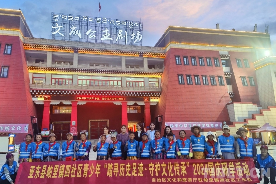 圖為研學(xué)游成員在文成公主劇場前合影 攝影:蔣馨悅