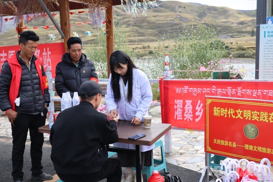 從海拔4700多米的卡子拉山,到一派田園風(fēng)光的濯桑片區(qū);從傳統(tǒng)文化氣息濃厚的勒通古鎮(zhèn),到一望無際的毛埡大草原,理塘縣共設(shè)立了19處新時代文明實踐旅游服務(wù)站,每處站點都配備了至少5名志愿者,從9點到18點,全天提供指路問詢、文明旅游宣傳、血氧飽和度測量以及免費開水、免費雨傘、應(yīng)急充電等志愿服務(wù),并協(xié)助交警開展交通安全宣傳、文明行車引導(dǎo)等工作。