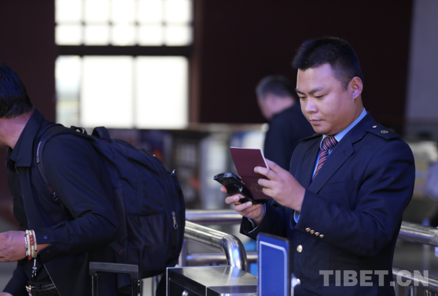 圖為拉薩火車站青年職工趙晨正在核驗(yàn)旅客證件 攝影:格桑央金