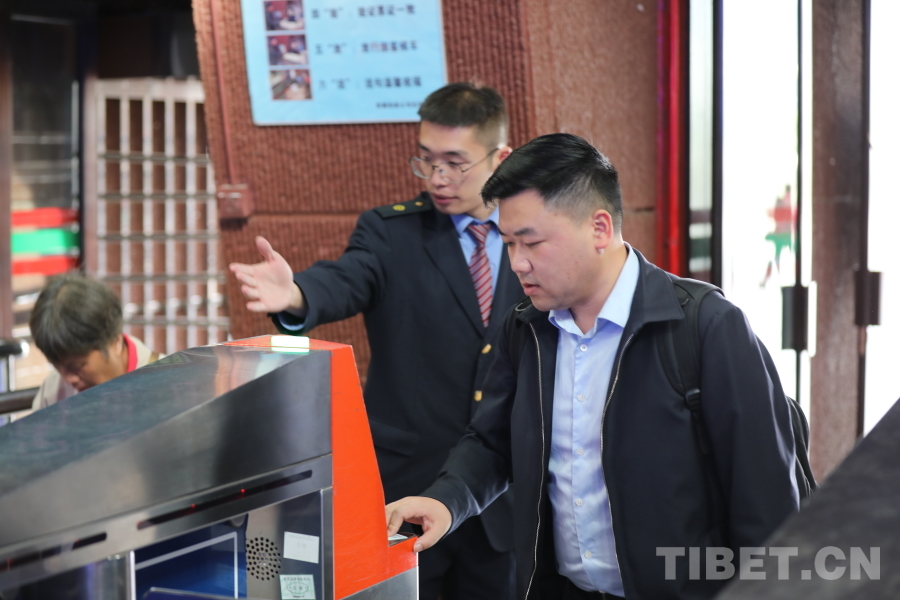 圖為拉薩火車站青年職工于志成正在進(jìn)站口協(xié)助旅客進(jìn)站 攝影:格桑央金