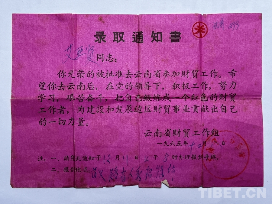 圖為1965年,云南省財貿工作組為訪談對象艾亞賢發(fā)的錄取通知書 供圖:李志農